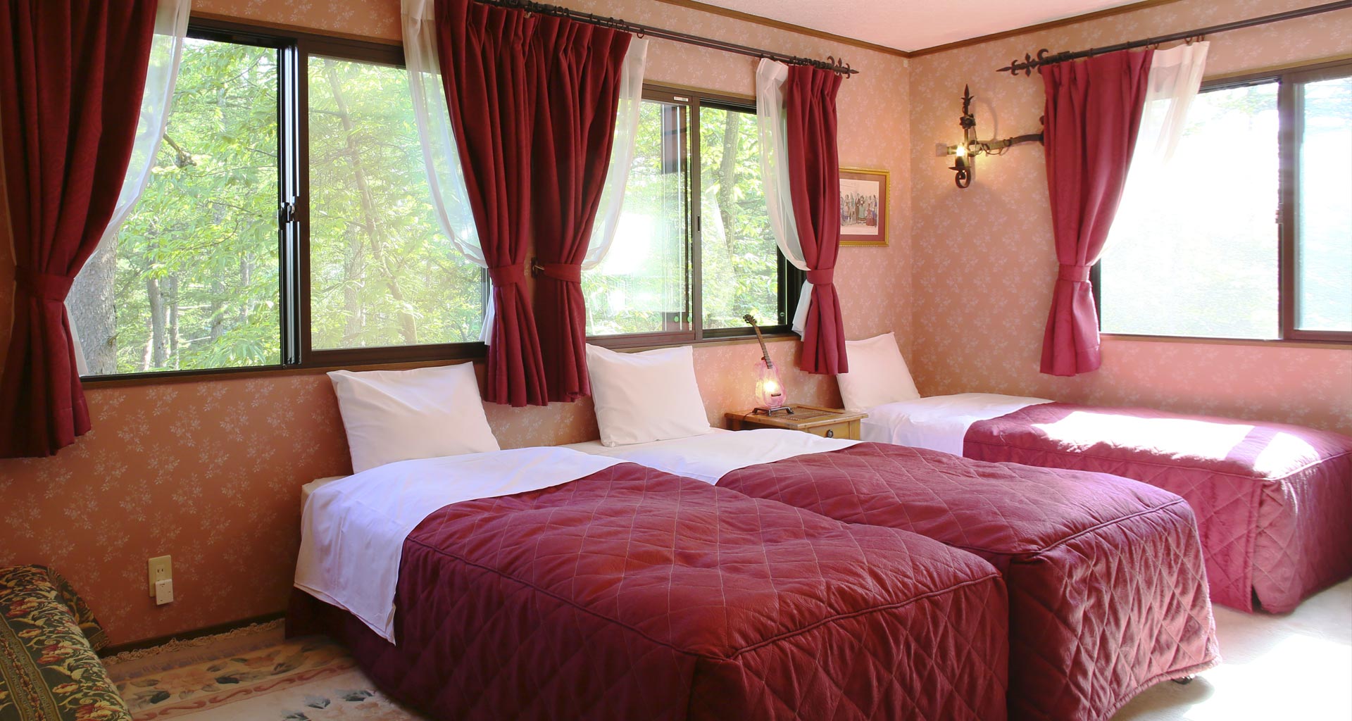カーテンから壁紙・照明・ドレッサーにいたるまで、部屋ごとにそれぞれのオペラのヒロインをイメージしたインテリアでコーディネートしました。お泊りいただいたお部屋のオペラを気に入っていただけるような、思い出に残るステイをしていただければ幸いです。